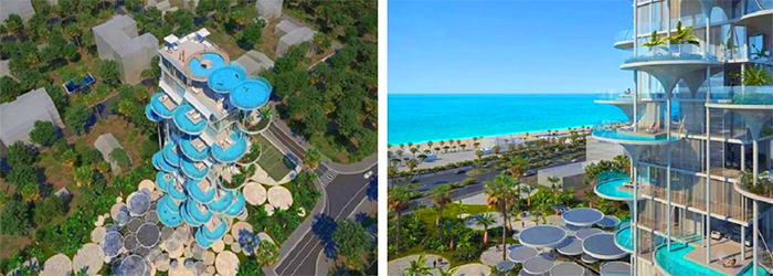 该项目不仅建筑外观颠覆了传统的设计,而且还是首个以悬浮的空中泳池为特色的住宅项目,透明的空中泳池悬浮于两栋楼之间。游泳的时候可以欣赏到城市壮观的美景。
